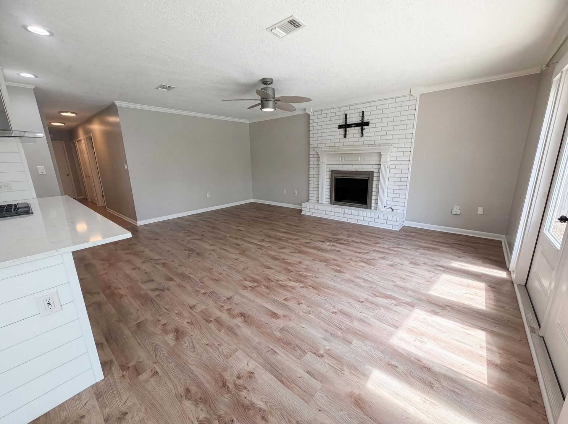 636 Merioneth Dr NE is a residence functional living spaces throughout. It includes a fireplace and a kitchen equipped with stainless steel appliances and an accent backsplash. An outdoor patio complements the area, leading to a in ground pool and a fully fenced in backyard, creating a defined outdoor space. This property provides practical amenities for comfortable living